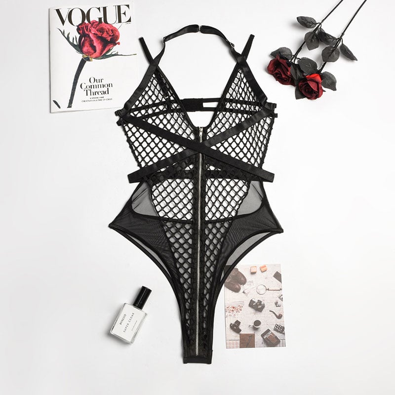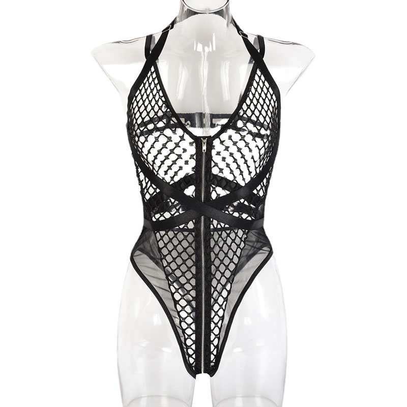 Sexy Hollow Fishnet Zipper Corset Leotard Jumpsuit Clubwear Halter Women's Lingerie Crotchless Teddy Skinny Bodysuit