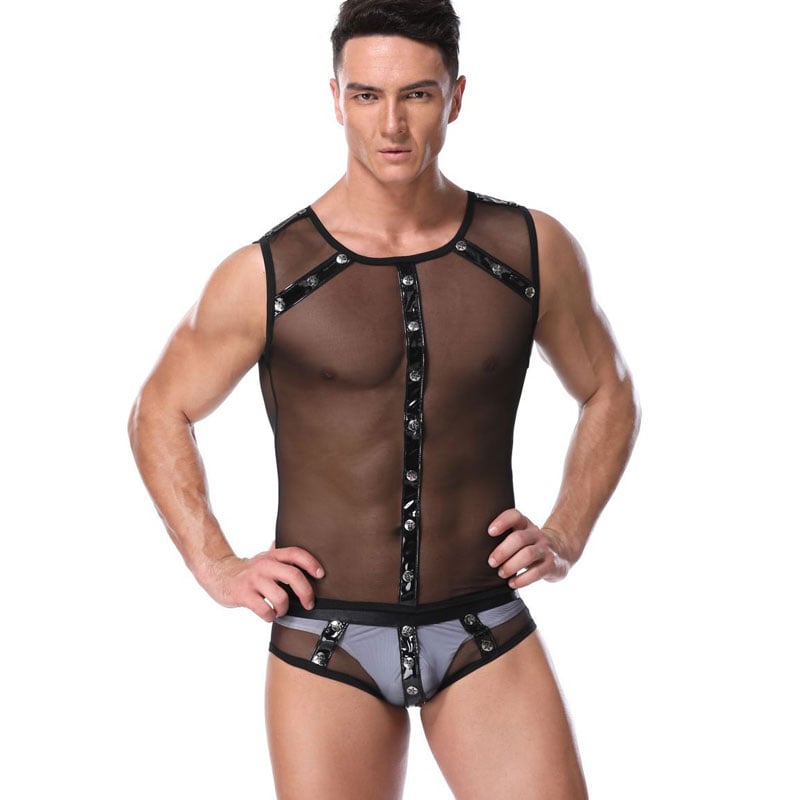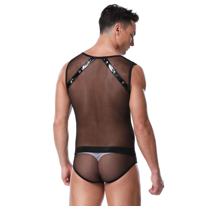 Sexy See Through Mesh Splice Line Gay Bar Costume Jockstrap Leotard Teddy Bodysuit Faux Leather Men's Lingerie