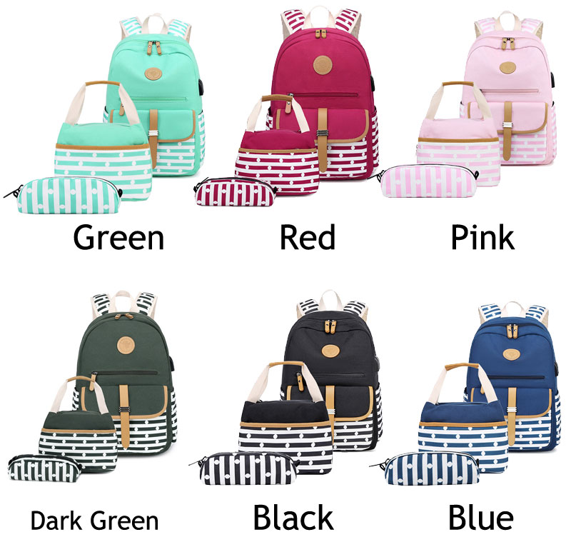 Single Buckle Stripe Dot School Bag For Teen Laptop Bag Rucksack With USB Port Handbag Student College Canvas Backpacks