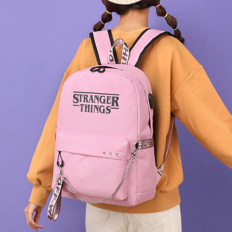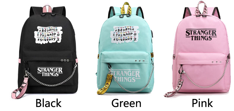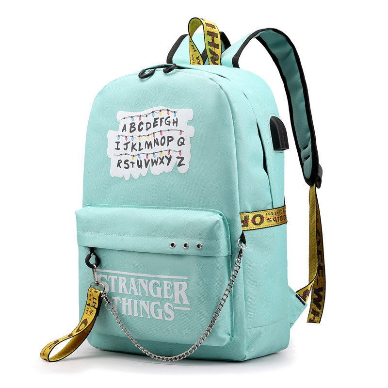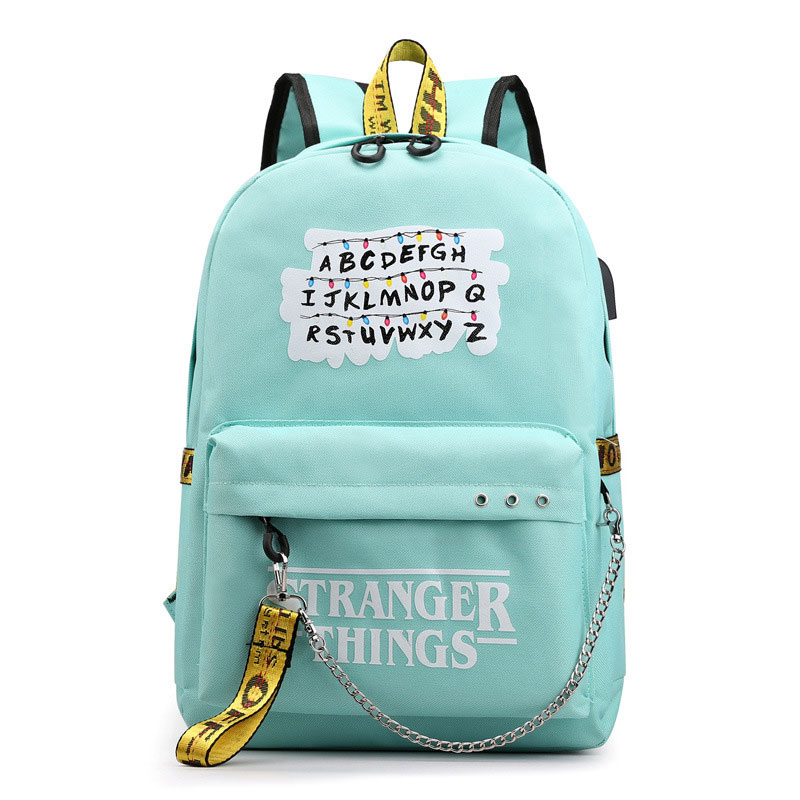 Stranger Things Alphabet Printing Student Backpack With USB Charging Port Gift For Kids Chain Decor School Backpack