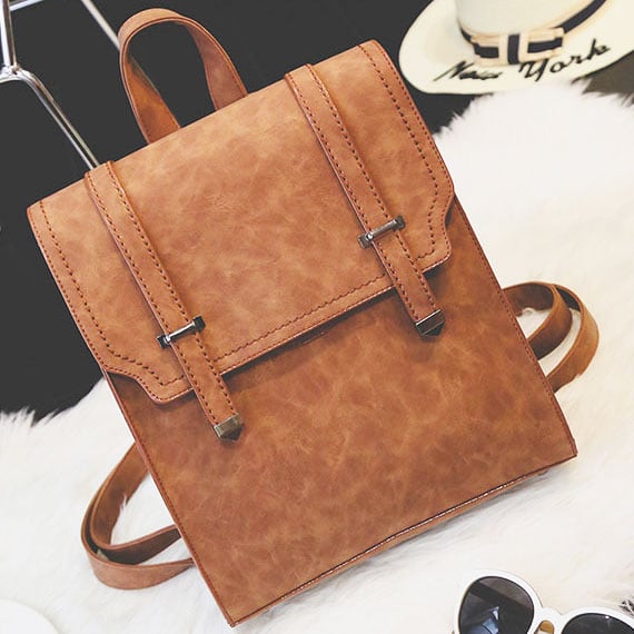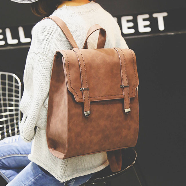 Retro Match Brown Large Scrub High School Matte Square PU Metal Lock Backpack