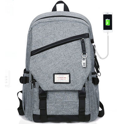 Leisure Travel USB Interface Student Backpack Gray Large Waterproof Canvas School Bag