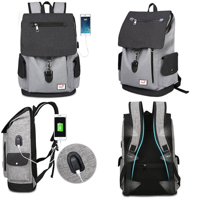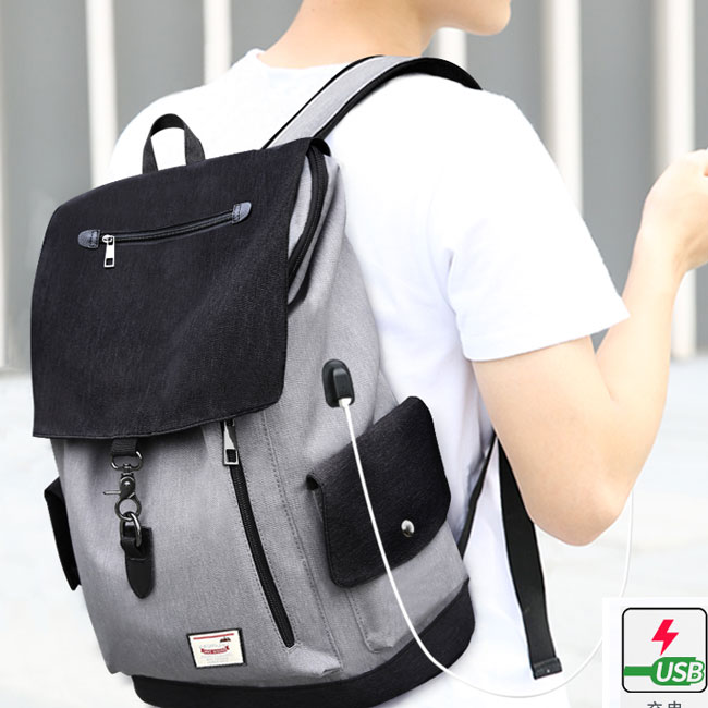 Leisure Boy's Canvas Large Capacity Flap School Student Rucksack USB Interface Travel Backpack