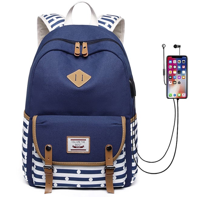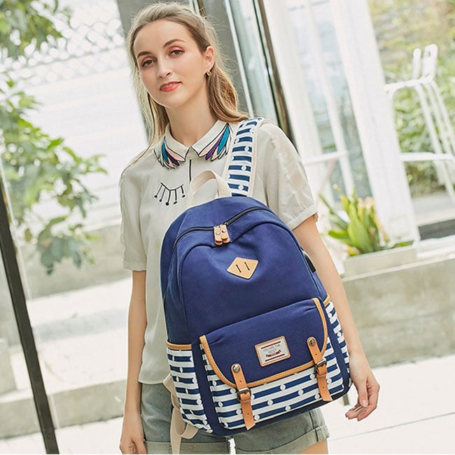 Fresh USB Interface Dot Double Buckle Canvas College Large Backpack Stripe High School Bag