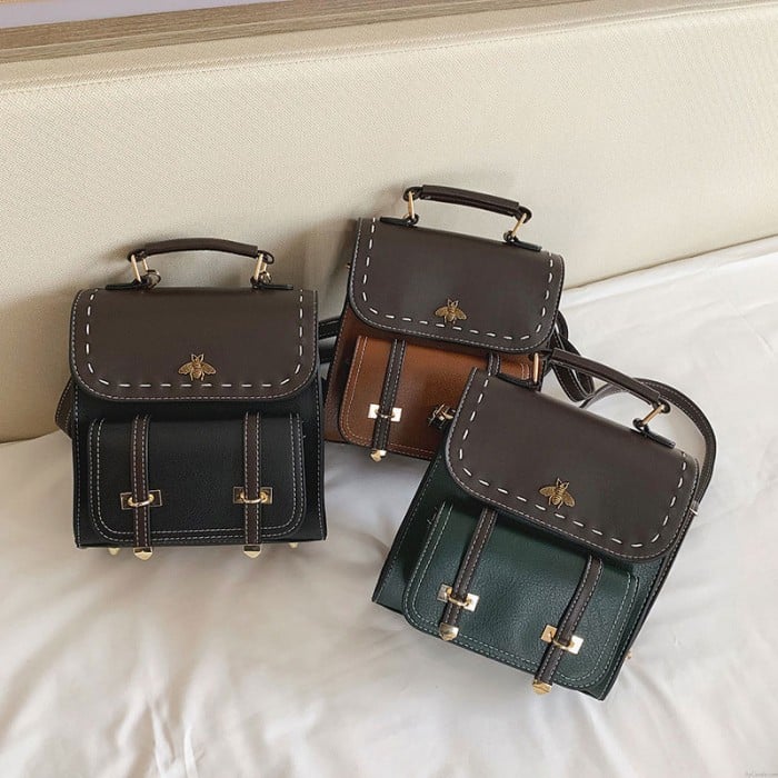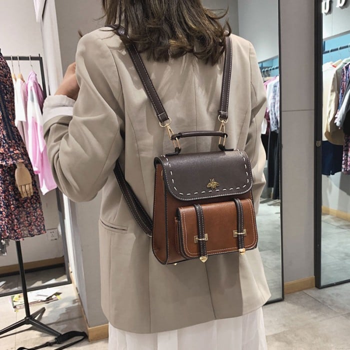 Retro Contrast Color Shoulder Bag Multifunction Bee Animal Logo Cartoon Double Buckle PU Backpack