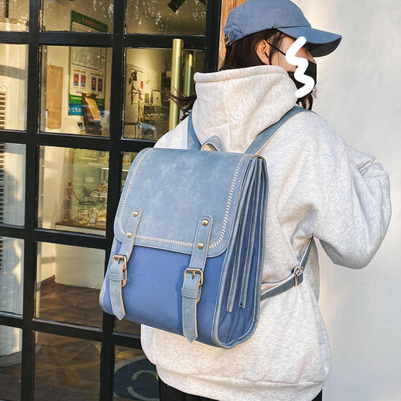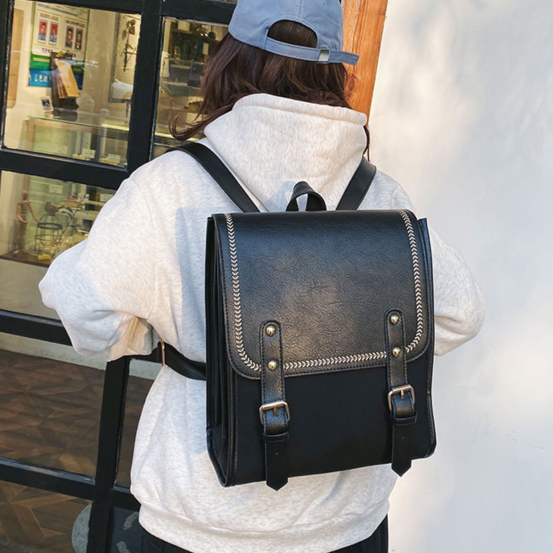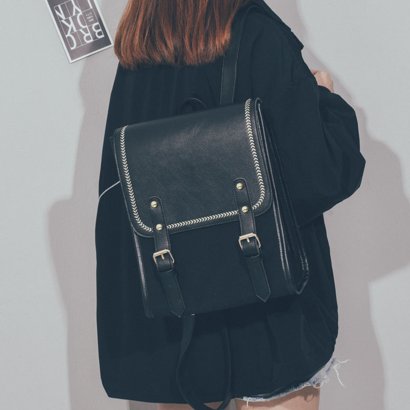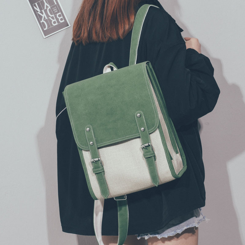 Fashion Double Buckle Rivets Embroidered Linen Square PU Canvas Bookbag Rucksack Backpack