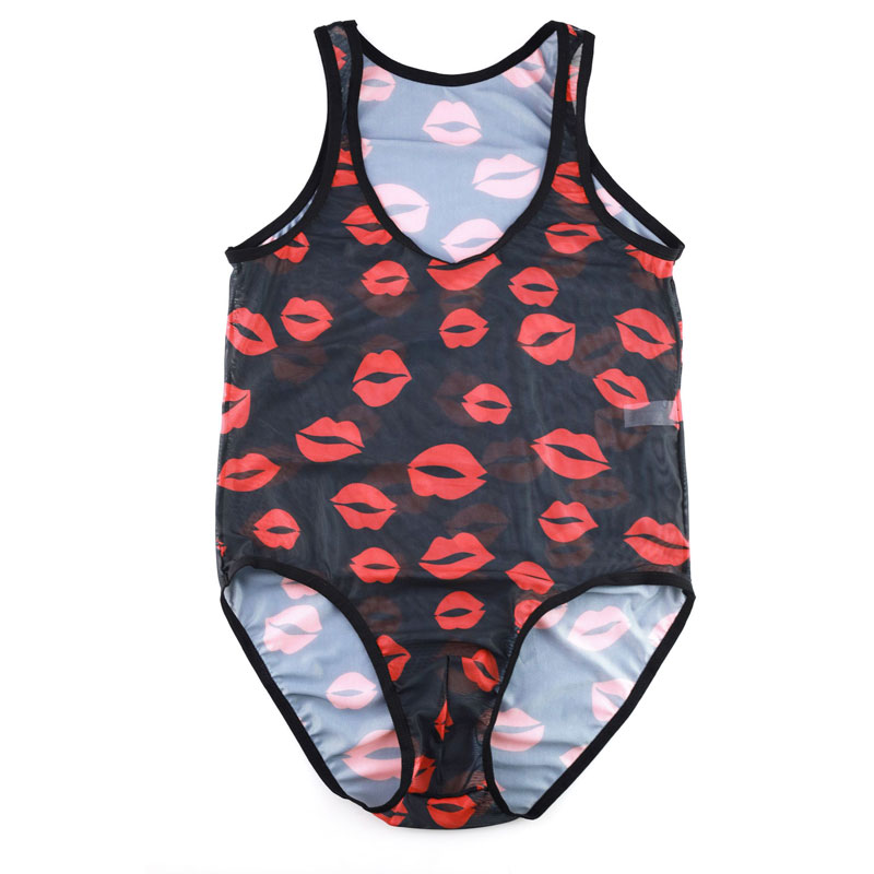 Sexy Mesh Triangle Teddy One-piece Fun Bodysuit Underwear Leotard Tights Lips Printing Men's Lingerie