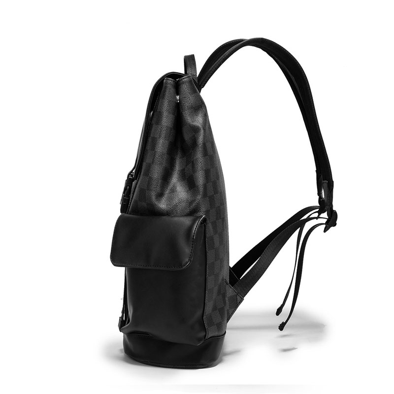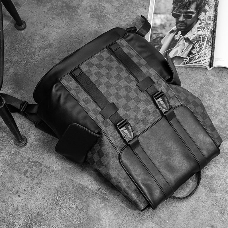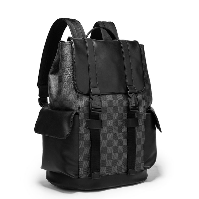 Casual Business Black Double Buckle Lattice Large Capacity Bookbag Rucksack For Men Faux Leather Laptop School Backpack Outdoor Rucksack