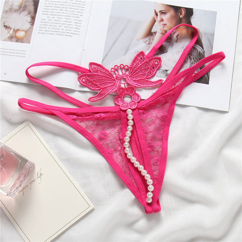 Sexy Butterfly Lace Pearl Crotchless Mesh Thin Briefs Lingerie Underpants Double Belts Underwear For Women Seamless G-String Thongs