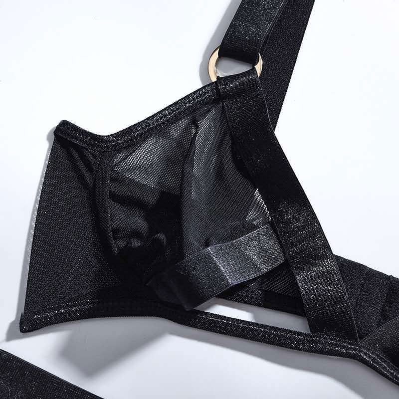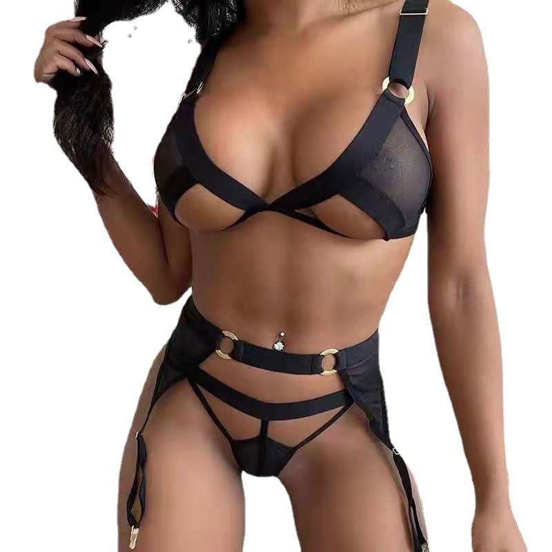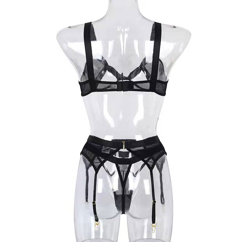 Sexy Strappy Rings Sheer Mesh Bra Panty Garter Belt 3 Piece Set Elasticity Women's Lingerie Exotic Underwear