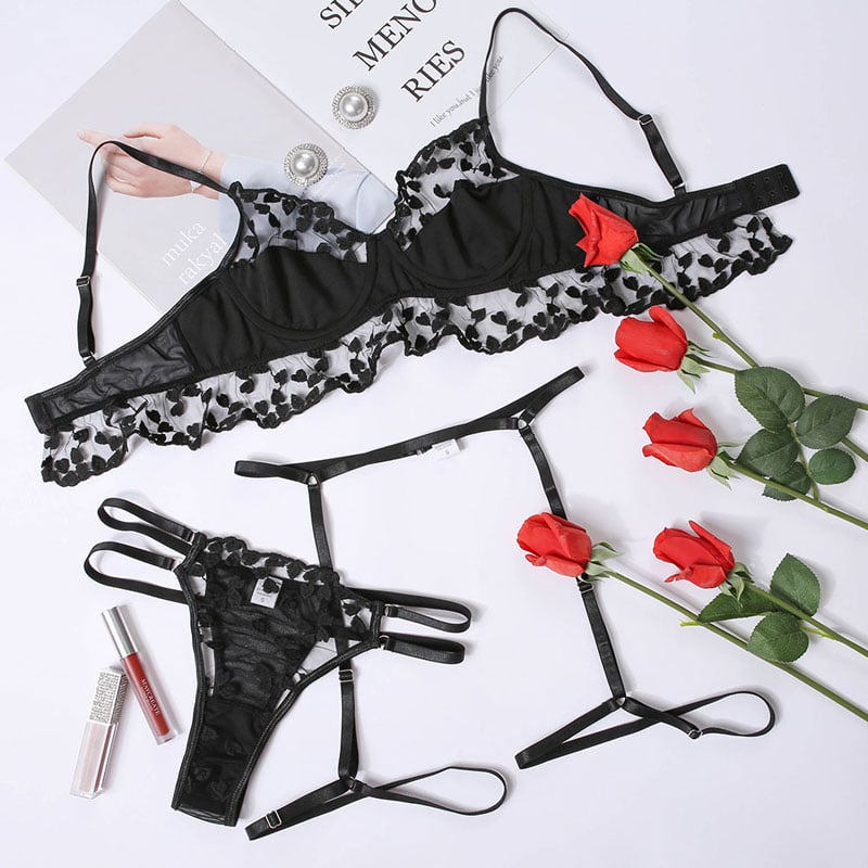 Sexy Embroidery Bra Panty Garter Belt 3 Piece Set Elasticity Exotic Underwear Love Heart Mesh Halter Women's Lingerie