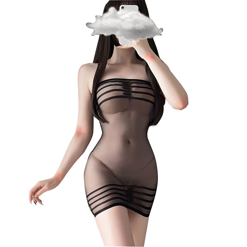Sexy Mesh Stripe Sleeveless Hip Wrap Mini Dress Perspective Women's Lingerie Chemise Bodycon Babydoll