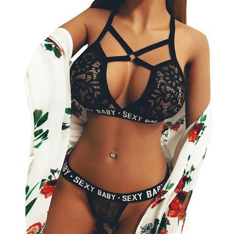 Sexy Baby Letter Belt Lace Halter Gather Tights Bodysuit Women's Lingerie Bra Thong 2 Piece Set Underwear
