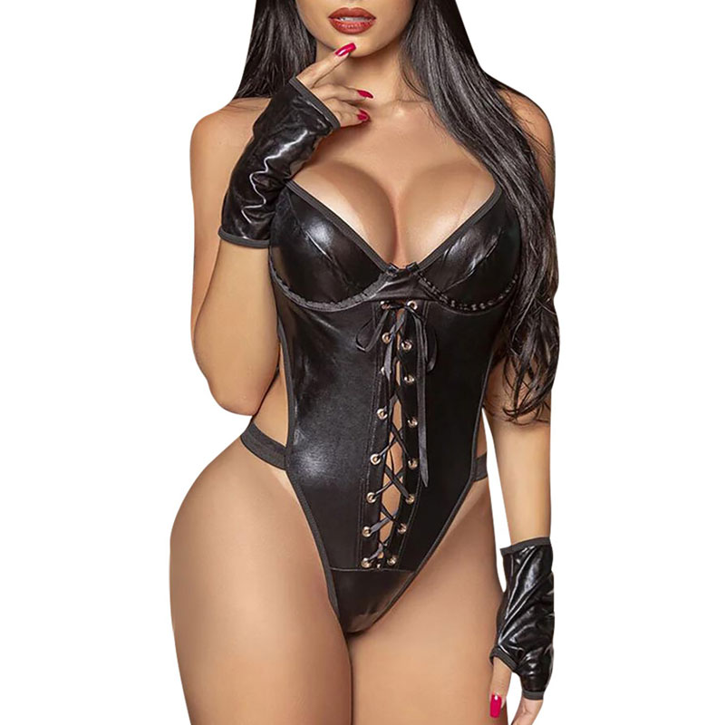 Sexy Lace Up Women's Leather Deep V Teddy With Gloves Backless Jumpsuit Bustier Clubwear Leotard Lingerie Bandage Corset Bodysuit