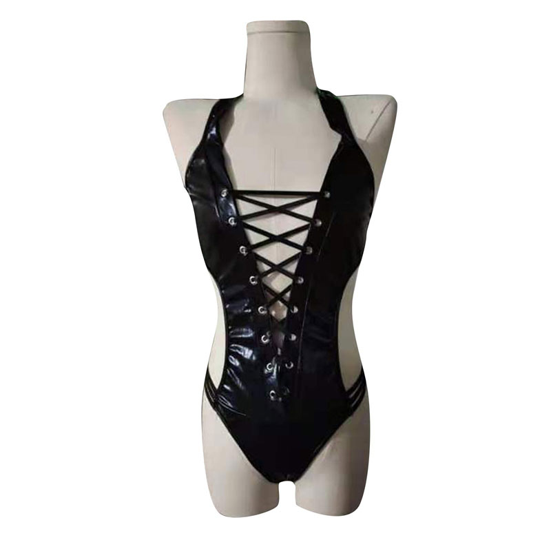 Sexy Lace Up Hollow Faux Leather Deep V Jumpsuit Backless Bandage Crotch Zipper Clubwear Leotard Lingerie Teddy Corset Women's Bodysuit