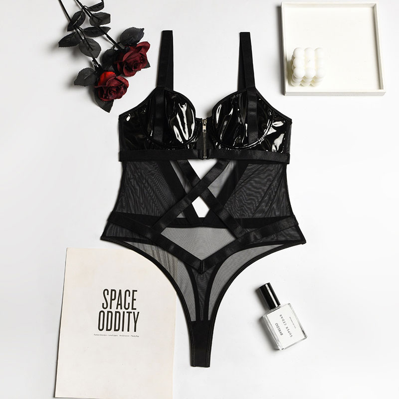 Don't be shy and invite your lover into your secret garden of seduction! This sexy Zipper Closure Bra Leather Splice Mesh Bodysuit teddy lingerie is fun to wear and sure to make your lover crazy.