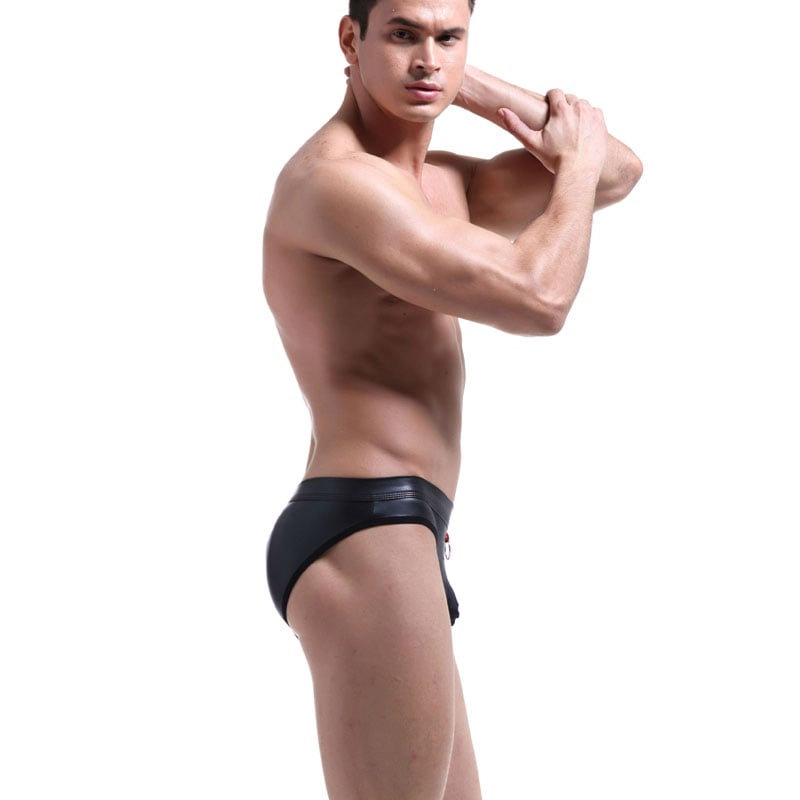 Mens Thong Material: 95% faux leather + 5% Spandex. Made of super stretchy silky soft fabrics, shiny glossy apperance, eye-catching, soft hand feeling, lightweight and skin-friendly, with no itchy to your skin, fitted to the body, elastic waistband, very easy to wear.