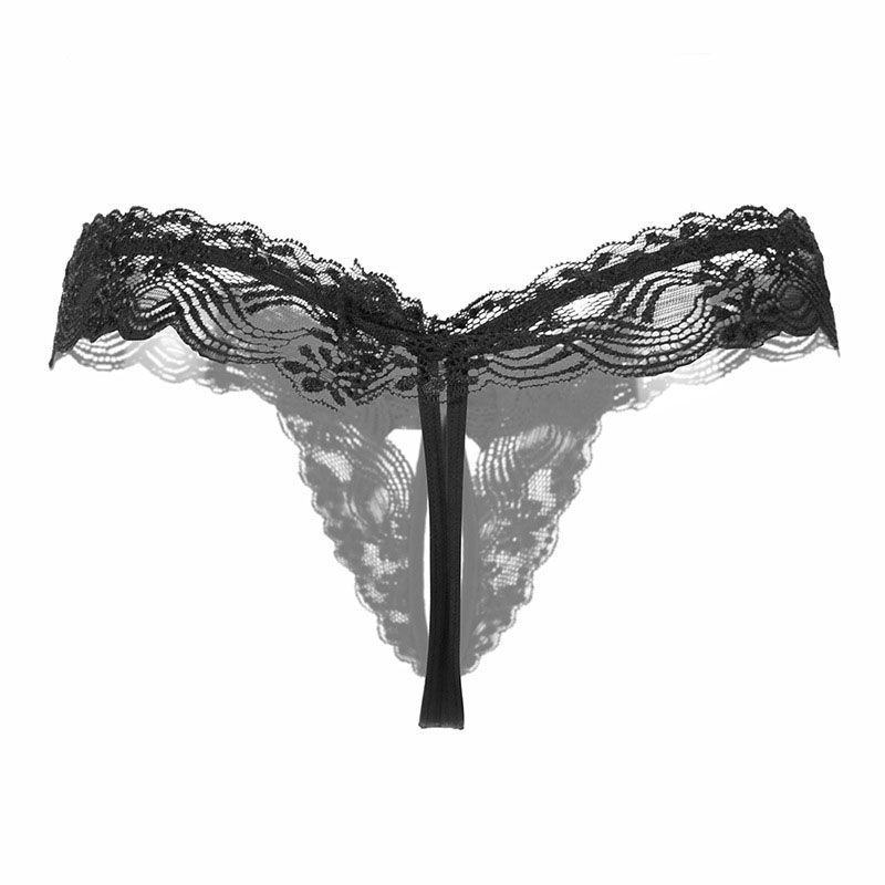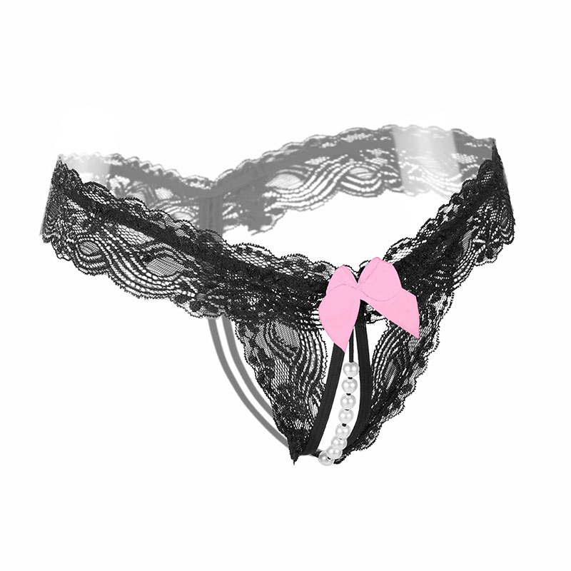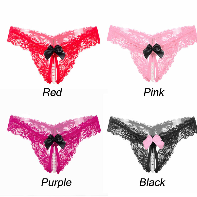 Sexy Crotchless Lace Pearl Massage G-String Thong Pants Women's Lingerie T-Back Underwear Briefs Bowknot Hollow Underpants