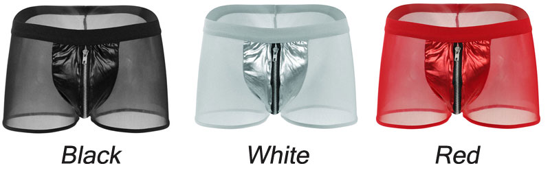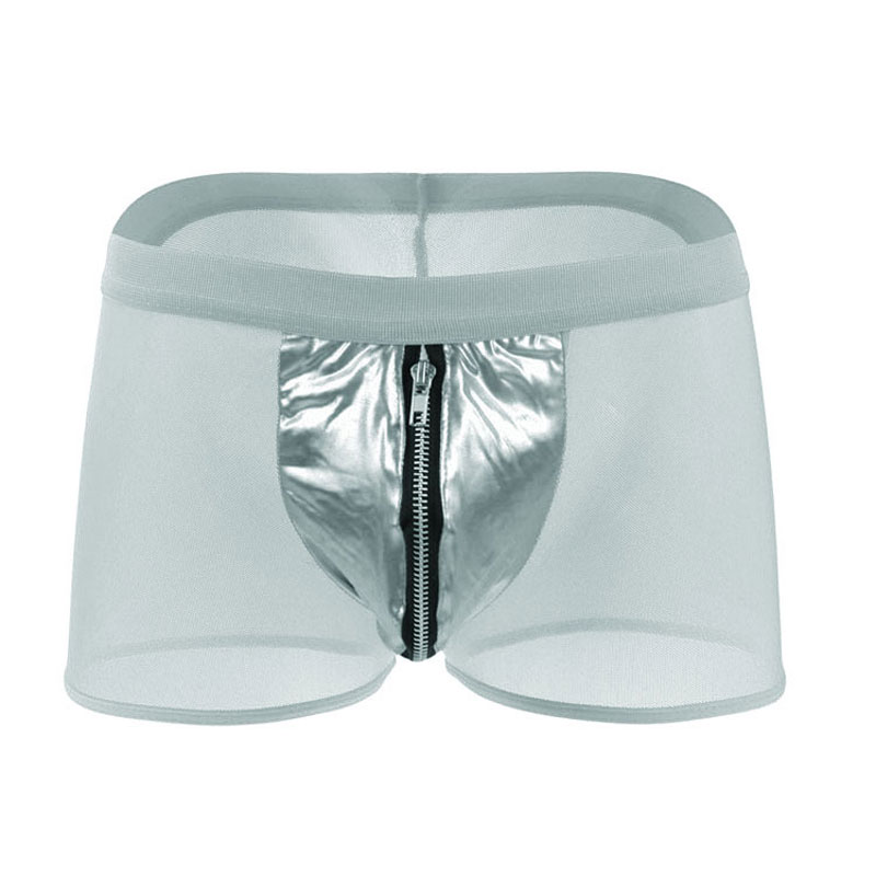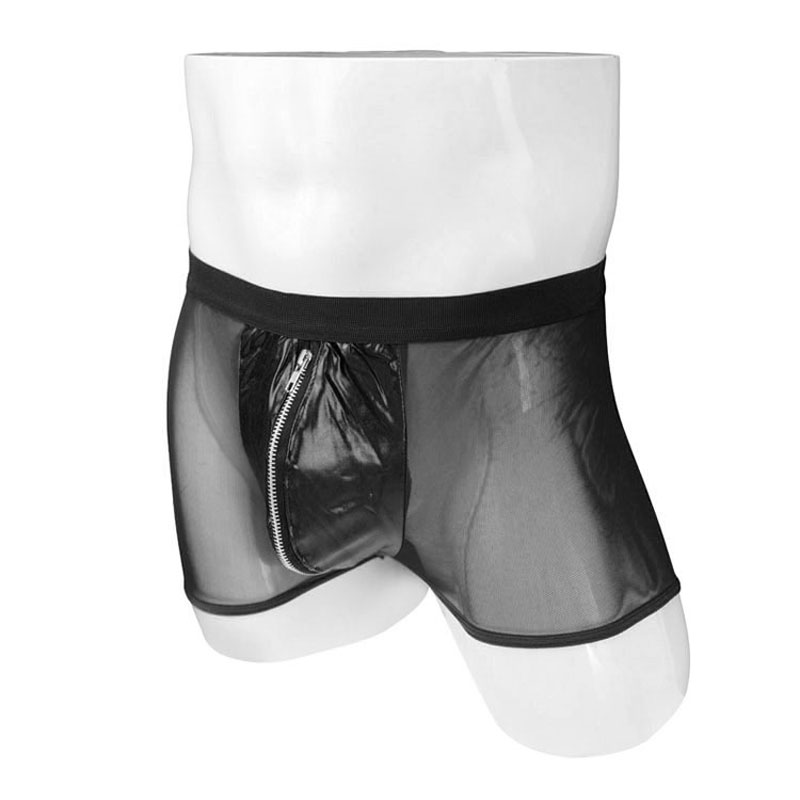 Sexy Faux Leather Splice Mesh Transparent Zippers Boxer Thong Underwear Panties Lingerie For Men Briefs