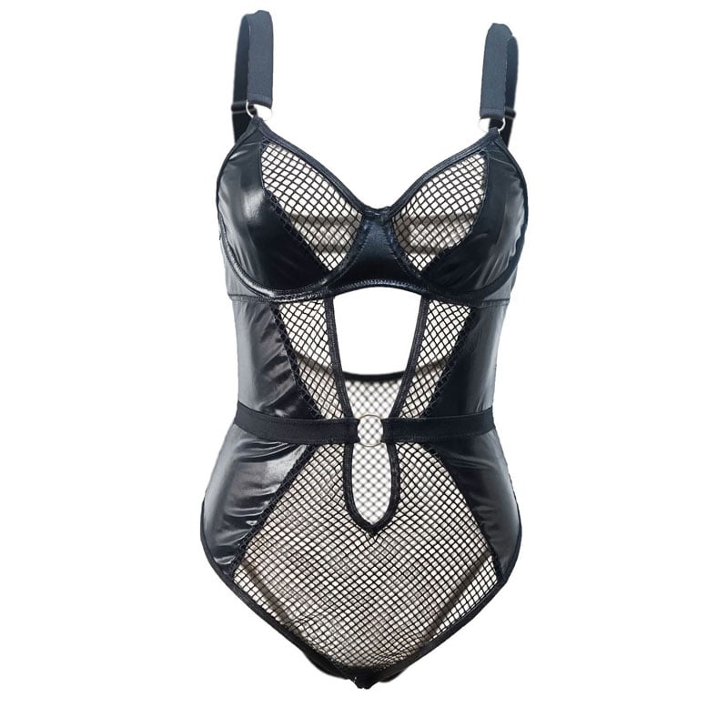 Sexy Fishnet Splice Corset One Piece Teddy For Women Lingerie Strap Faux Leather Bodysuit