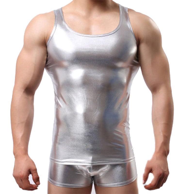 Shiny Faux Leather Soft Silky Vest Underwear Packing plastic Tops Slim Fit Fitness Sports Support Men's Lingerie