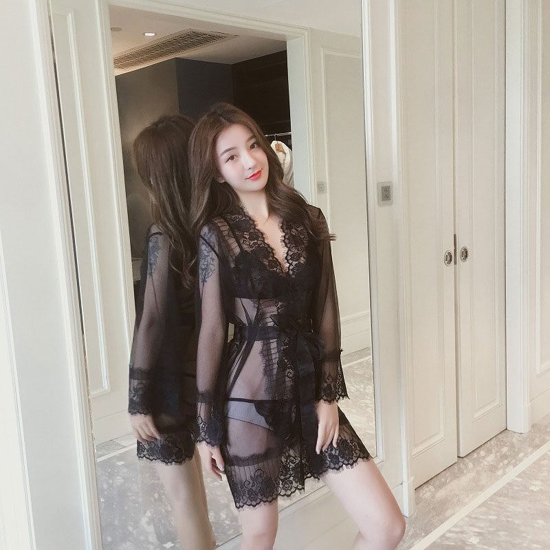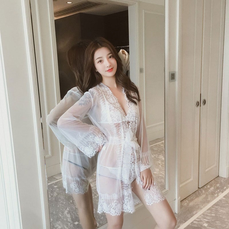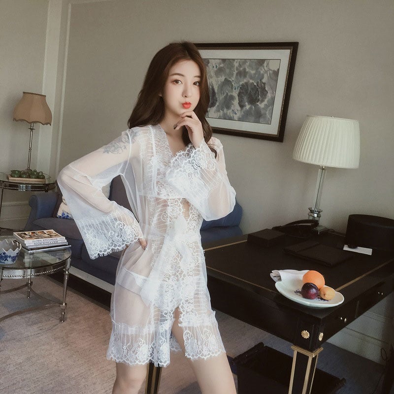 Sexy Lace Kimono Robe Swimsuit Bathrobe Gown See Through Lingerie Chemise Robe Long Sleeve Cover Up Babydoll Nightdress
