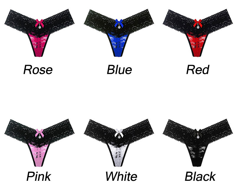 Sexy Bowknot Contrast Color Diamond Transparent Floral Lace T-back Lingerie Briefs Women's Panties Stretch Thong Underwear
