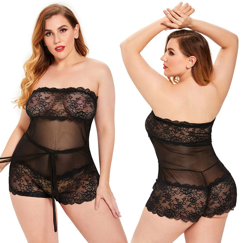 Sexy Plus Size Strapless Mesh Transparent Sleepwear Lingerie Nightwear Women's Nightgown Chemise Lace Babydoll