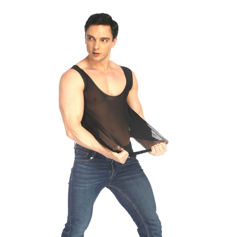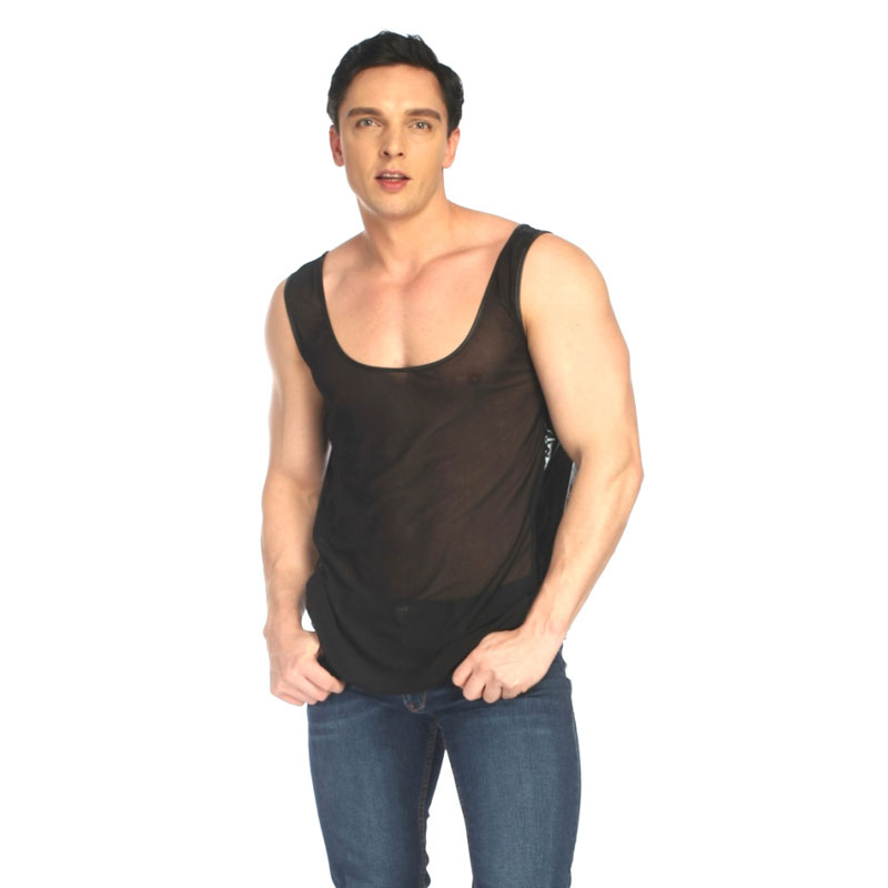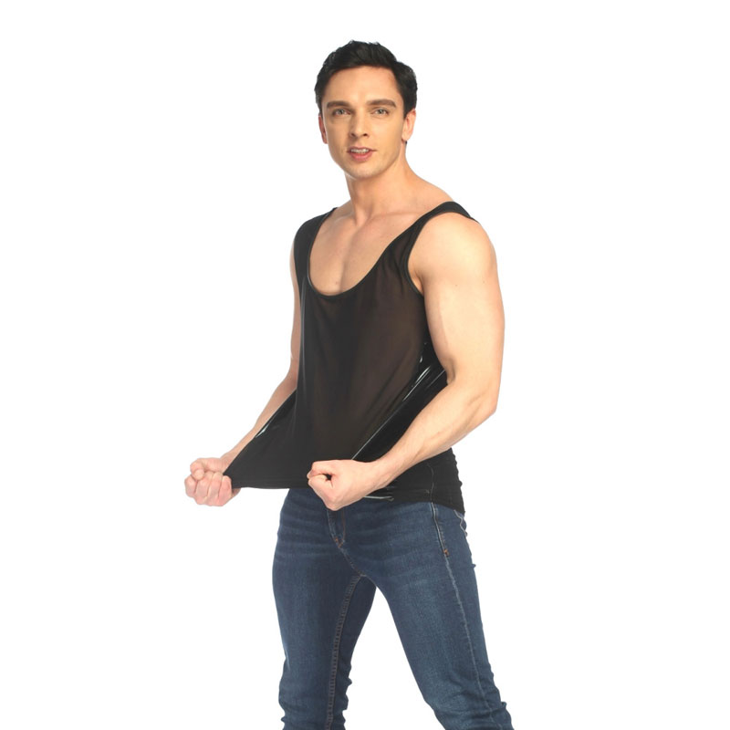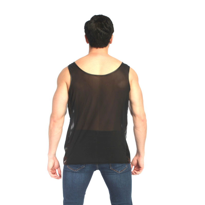 Sexy Thin Transparent Mesh Splice Faux Leather Sleeveless Muscle Workout Men's Lingerie Vest Tank Tops Shirt