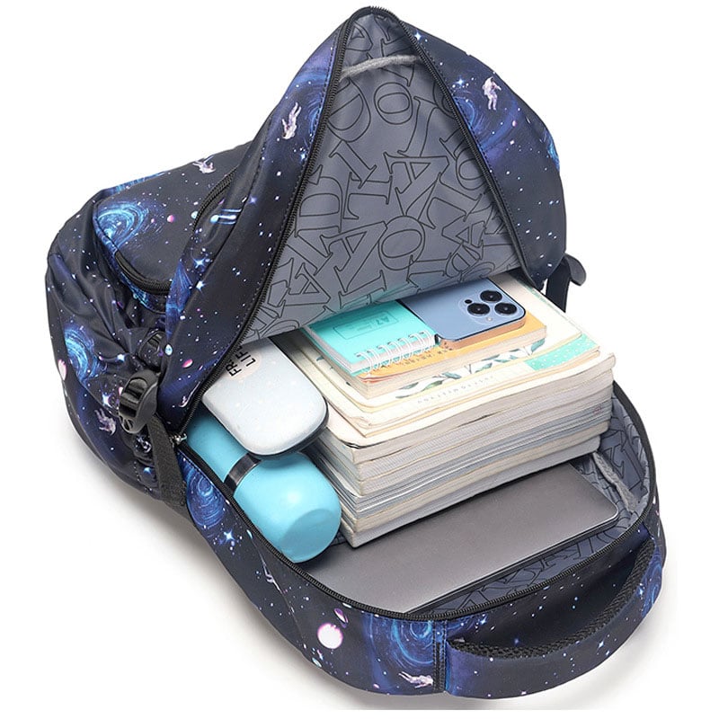 One Universe Galaxy Star Print backpack to solve all travel troubles. The large capacity backpack has multiple divider pockets, easy for holding , ipads, Phone, binder, water bottle, umbrella, readers, journal, magazine, clothes, pens, wallet and so on.